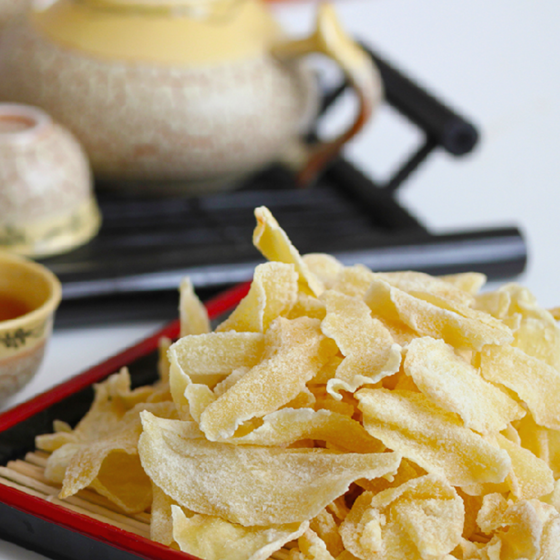 - Mứt gừng được làm từ gừng tươi nguyên chất, lát mỏng, sên thủ công cùng đường tạo nên vị cay nồng, ngọt dịu hài hòa, giúp làm ấm cơ thể và hỗ trợ tiêu hóa.